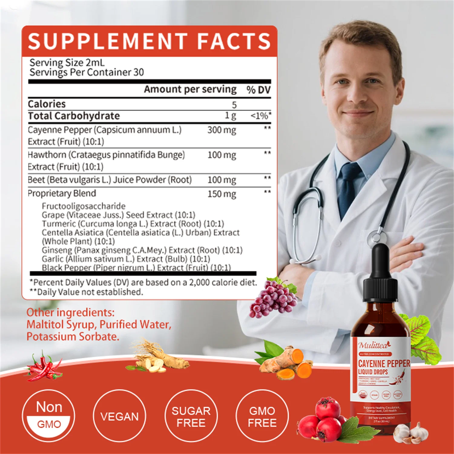 Cayenne Pepper Drops Supplement Liquid, Cayenne Pepper Extract with Hawthorn, Beet Root Powder, Turmeric Curcumin, Organic Ginseng, Garlic Extract, 2 Pack By Mulittea