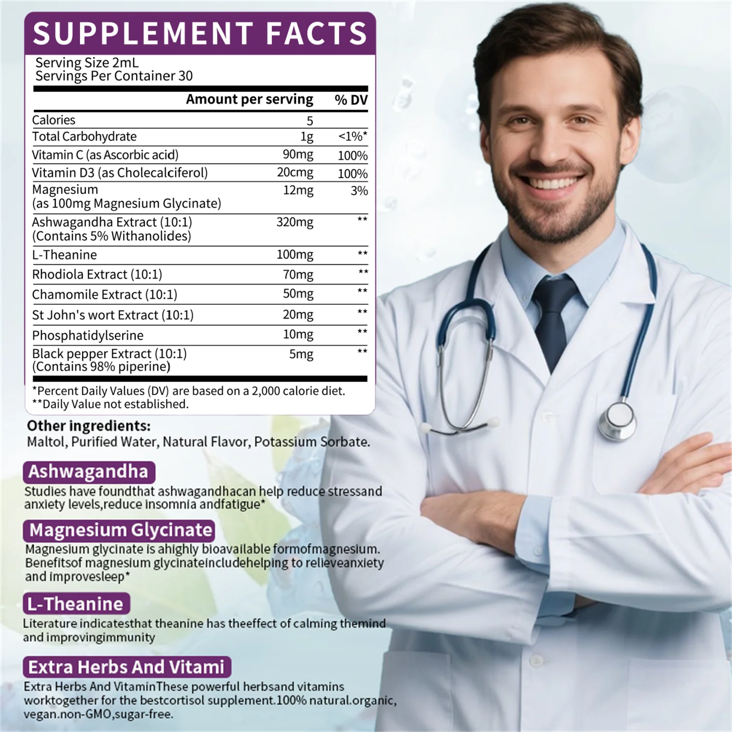 Cortisol Supplements for Women Men, Cortisol Reducer Detox Manager w/ Magnesium, Ashwagandha, L-theanine, Hormone Balance Liquid Drops Mood, Focus, Sleep Support - 2 Fl.oz, Blueberry Flavor