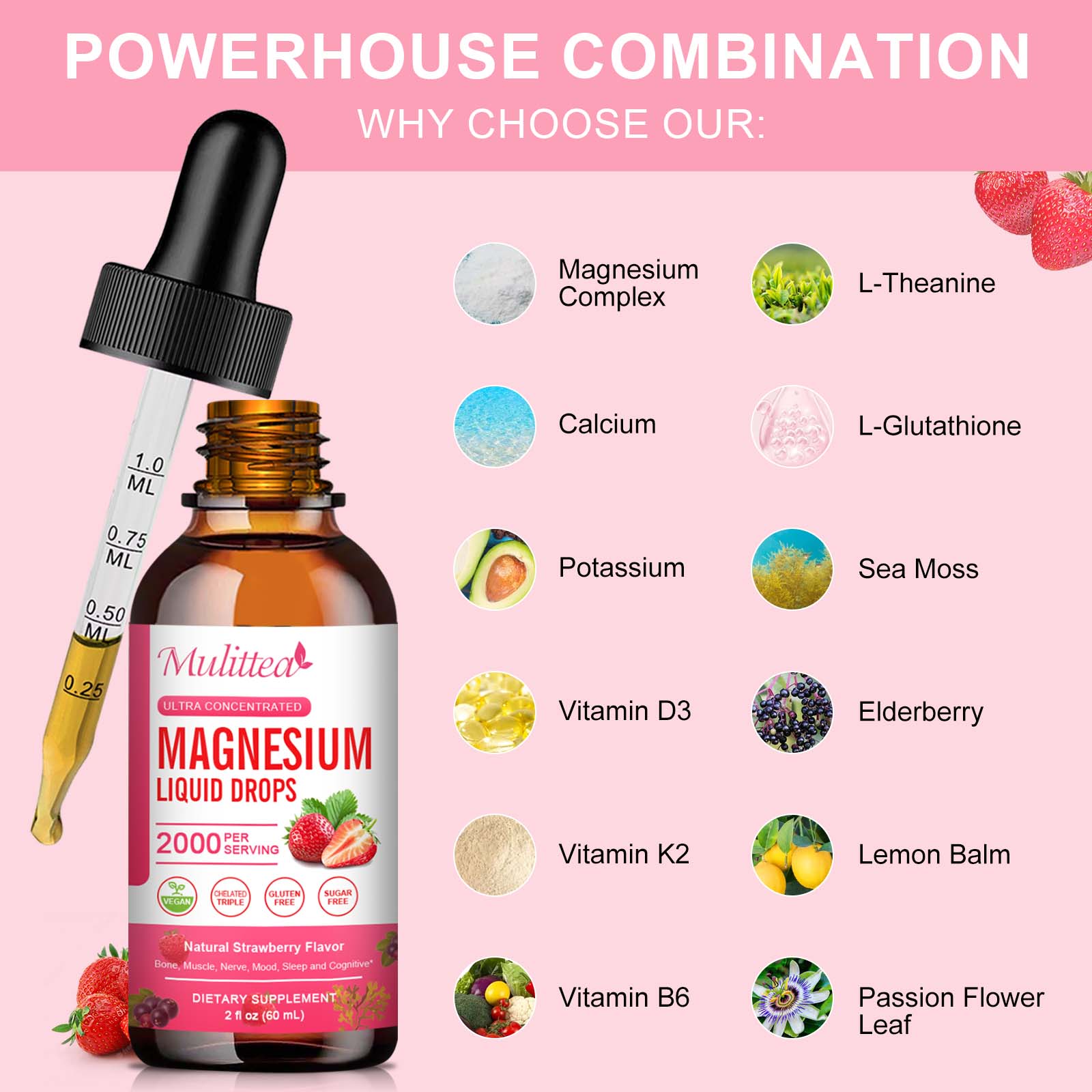 Mulittea Magnesium Glycinate Liquid is a high-potency, fast-absorbing formula designed to support better sleep, muscle relaxation, mood balance, and overall nervous system health. Made with bioavailable forms of Magnesium Glycinate, Citrate, and Malate, plus Vitamin D3, K2, B6, L-Theanine, and L-Glutathione, this advanced complex promotes calm, focus, and energy.